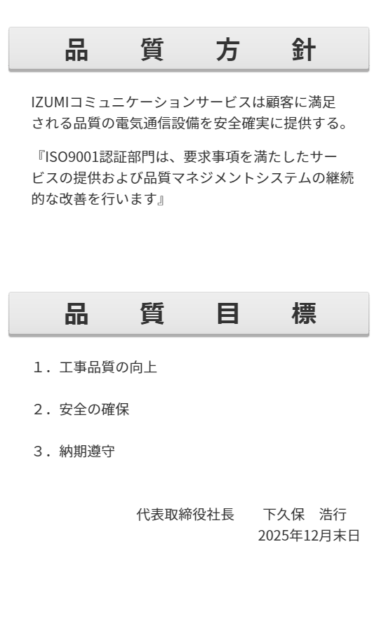 IZUMIコミュニケーションサービス株式会社 品質方針・品質目標